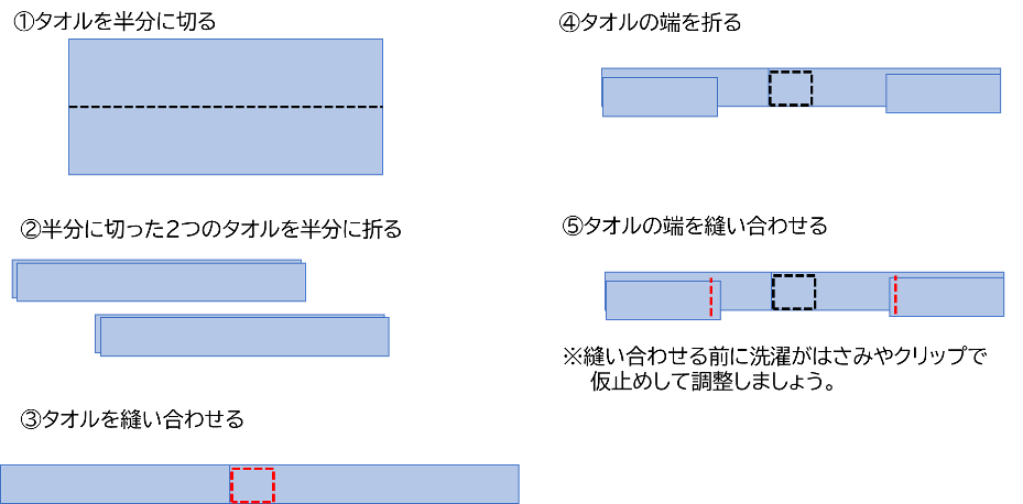 さらに、ループ式アームスリングはタオルなどを用いて、以下の①~⑤の手順で手作りすることも可能です。この際、手縫いに比べてミシンなどを使用して縫製することで強度が増し、壊れにくくなります。ただし、既製品ではないため、手作りの場合は強度に課題が生じる可能性があります。