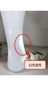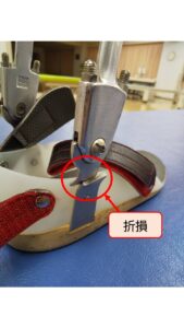 プラスチック装具の破損で多いのは,プラスチック本体の経年劣化です。プラスチックはたわむことで可動性を得ますが,たわむ際に一部分に負荷がかかることで,白色化するのが特徴です。そのまま使い続けると,軸の部分が折れてしまう可能性があるので,お気づきの際はお早めに医師や理学療法士,義肢装具士にご相談ください。