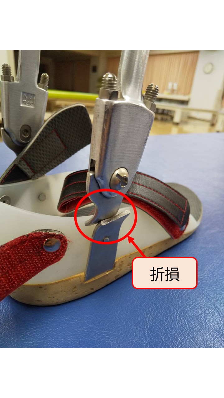 両側金属支柱付き装具は,足や膝の関節軸の部分で破損することがあります。歩いていて異音がする,関節軸が適正に動かない,などは破損の可能性があります。また,めったにありませんが金属支柱自体が折れてしまうことがあります。そのまま使用するのは大変危険なので,かかりつけの医師や理学療法士,義肢装具士にご相談されることをお勧めします。