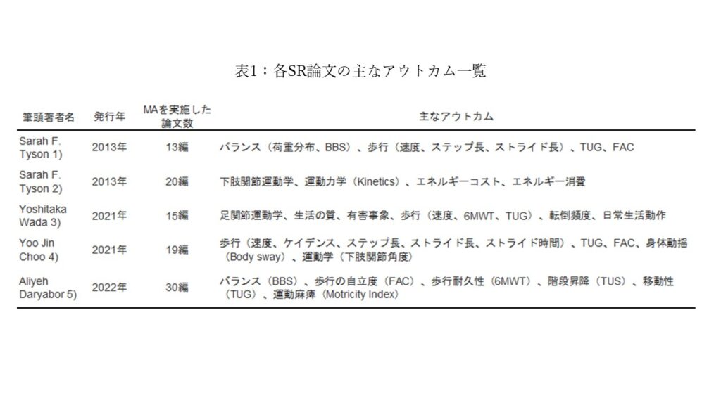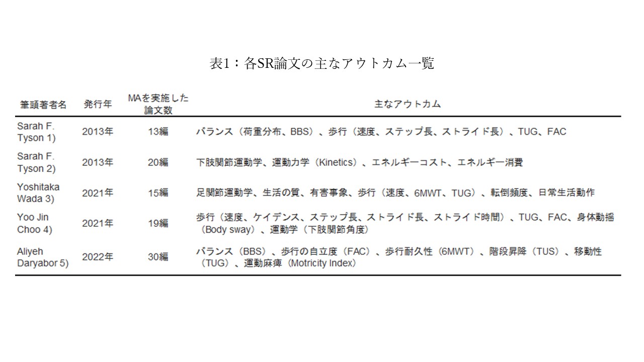 AFOの効果に関するSRおよびMAを報告した論文はいくつかあります。アウトカム(AFO装着による効果を受けるであろう項目)は主に①歩行速度やステップ長、Timed up and go test(TUG)、6分間歩行試験、歩行自立度(Functional ambulation category, FAC)に代表されるような歩行アウトカム、②階段昇降などのパフォーマンス指標、③Berg balance scale(BBS)や重心動揺計データによる姿勢非対称性などに代表されるバランスアウトカム、④関節角度や筋活動などの運動学的データが挙げられていました(表1)1-5)。歩行自立度や6分間歩行試験は非常に大きい効果4,5)が、歩行速度やTUG、BBSはいくつかの論文で中程度のAFO装着の効果1,3,5)が認められました。