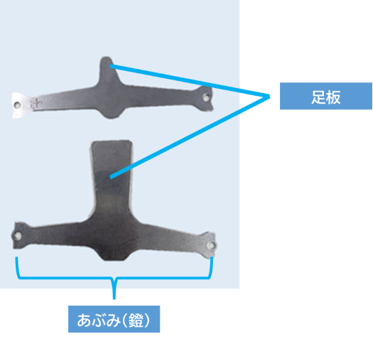 足板は足底部を支持する板であり、連結部分をあぶみと言います。あぶみは金属板をコの字に曲げて加工し、足部を接合します。通常は足継手と連結されています。足部(足継手・足部パーツ)の詳細は別記事でより詳しく解説しています。さらに詳しく知りたい方は、こちらの記事をご参照ください。