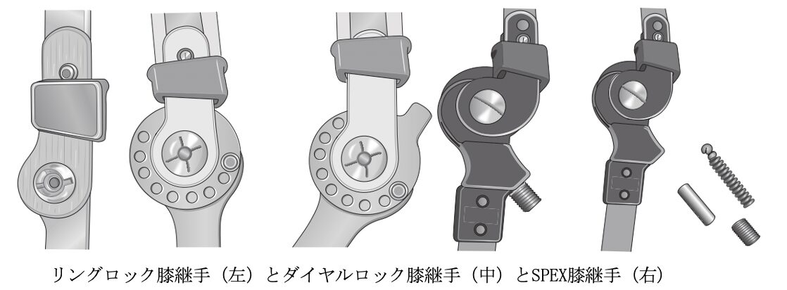 他にも、円背や膝関節屈曲拘縮がある場合には、ダイヤルロック膝継手を選択することがあります。また、膝関節伸展の弱化がある場合には、伸展補助機構としてSPEX(spring extension)膝継手を選択するなど、症例に応じてさまざまな種類が用いられます。
