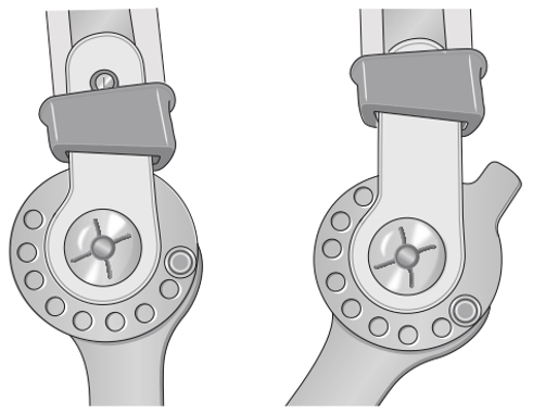 【機能】膝関節伸展固定、任意にて約5°(啓愛ダイアルロック)や10~20°(AOPダイアルロック)刻みで固定、屈曲遊動