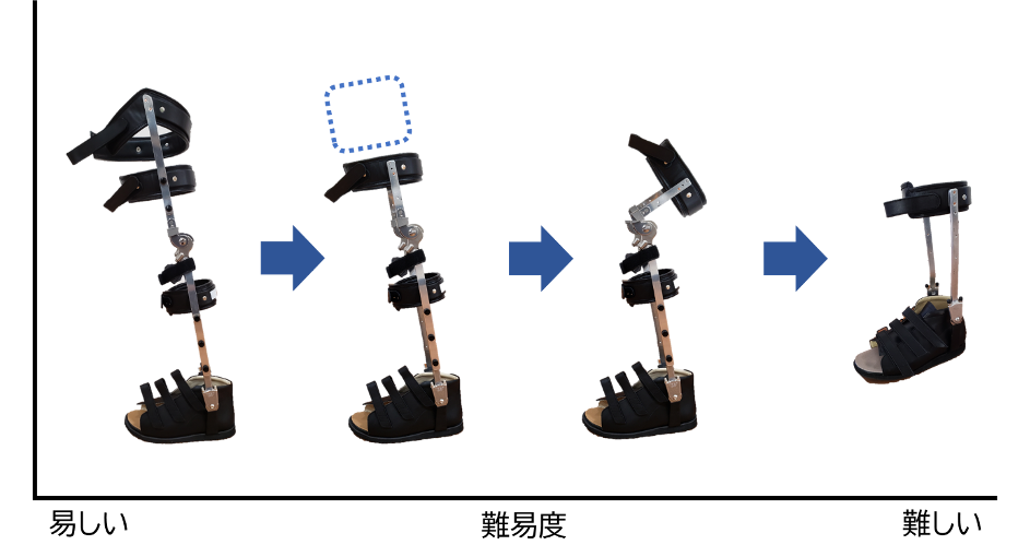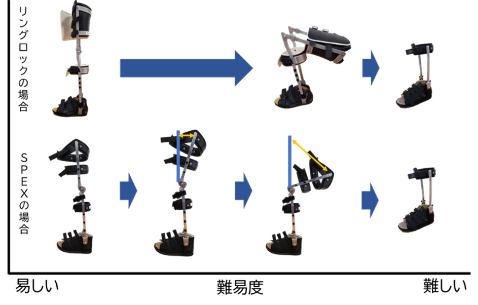 一方、SPEXを用いた場合は、「膝継手固定」から「膝継手一部可動(補助または固定)」を経て「膝継手遊動」、そして「短下肢装具への移行」という段階を踏むため、「膝継手固定」から「膝継手遊動」までの間に段階的な難易度設定が可能となります。