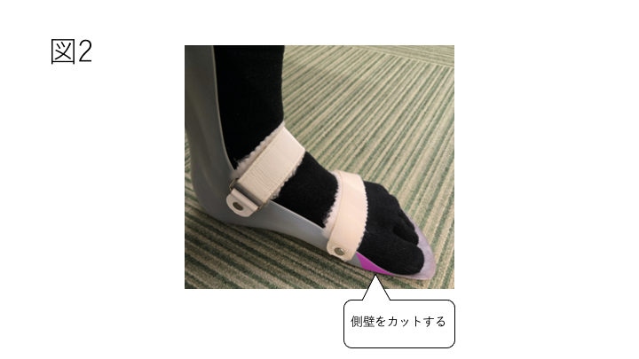 装具の側壁とは、足部の横を支える立ち上がりの部分です。この側壁が高すぎたり長すぎたりすると、靴の開きが足りず、装具ごと足を入れにくくなることがあります。