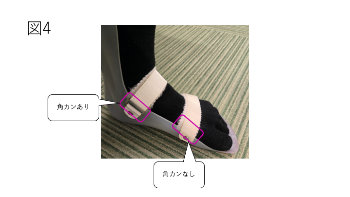 前足部の固定ベルトに角環を使う構造では、靴の中で厚みが出たりすることがあります。そのため、場合によっては、角環を用いない形に変更することで、ベルトの厚みや引っかかりが減少し、装具が靴の中におさまりやすくなることがあります。
