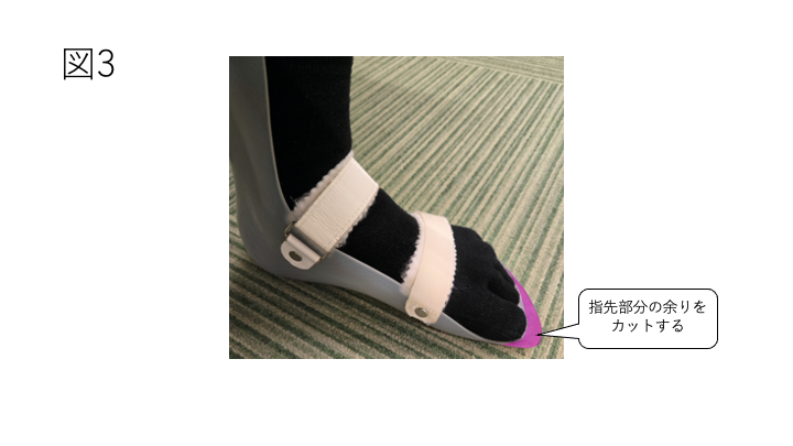 ただし、つま先部分の長さには、足部の支持や靴の中での安定性に関わる意味もあります。短くしすぎると、前足部の支えが不十分になったり、装具と足の位置関係が崩れたりすることがあります。