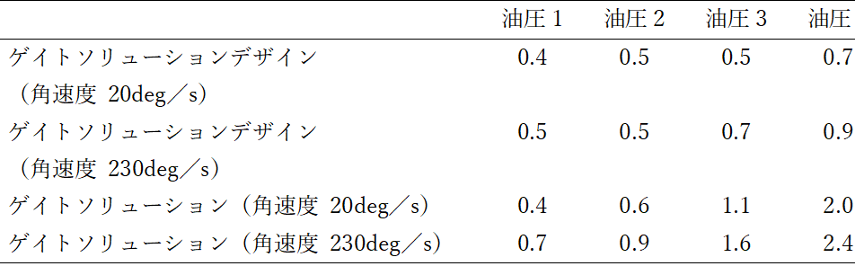 - 角速度:230deg/s:油圧1→7、油圧2→0.9、油圧3→1.8、油圧4→2.4