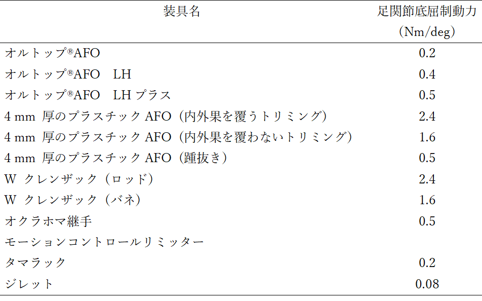 プラスチックAFO(継ぎ手なし)の比較(表1)(図1):