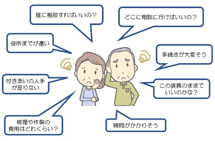 こんなとき皆さんはどうしていますか?装具の修理や作製をしたいと思ったとき、「誰に相談すればいいの?」「費用はどれくらい?」「このまま使っていて大丈夫なの?」など困ったことはありませんか?そんな現場でよく聞かれる声を、以下の図にまとめました。