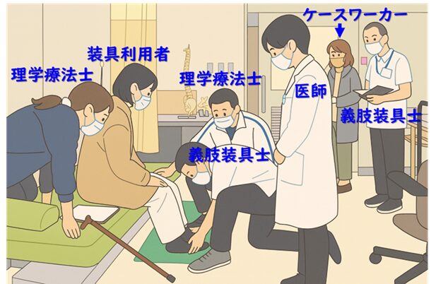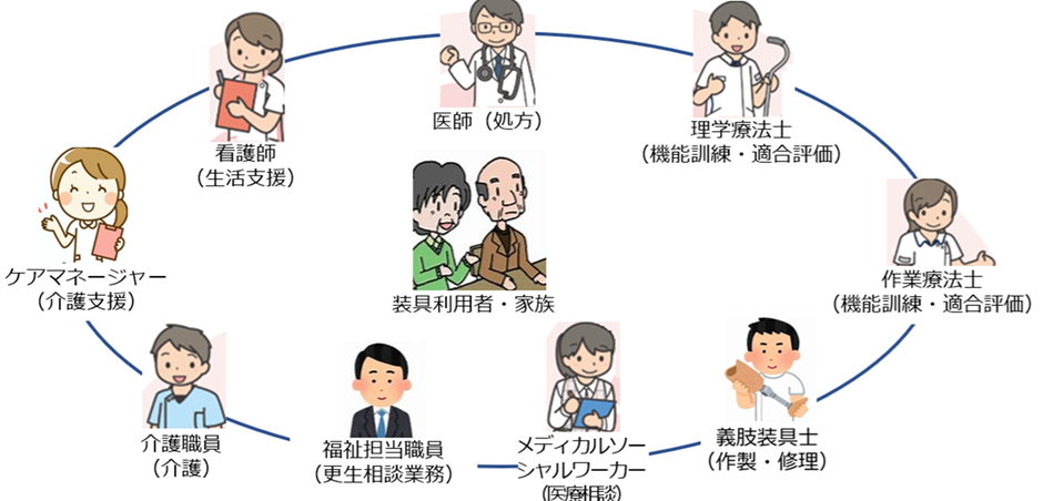 装具の選択や活用には、さまざまな専門職が連携して関わっています。病気になって間もない急性期の医療現場から、続く回復期、そして退院後の在宅生活に至るまで、装具の使用には多くの職種の支えや連携が欠かせません。装具に関わる職種の全体像を図に示します。