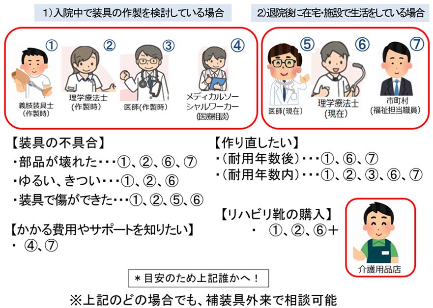 デイサービスやデイケアなどの通所施設を利用していたり、訪問リハビリなどで理学療法士と関りがある場合または装具に関わりがあるかかりつけの医師がいる場合は、まずそちらに相談してみてください。個々の状況に応じて、誰に相談したらよいかを図で示しました。。