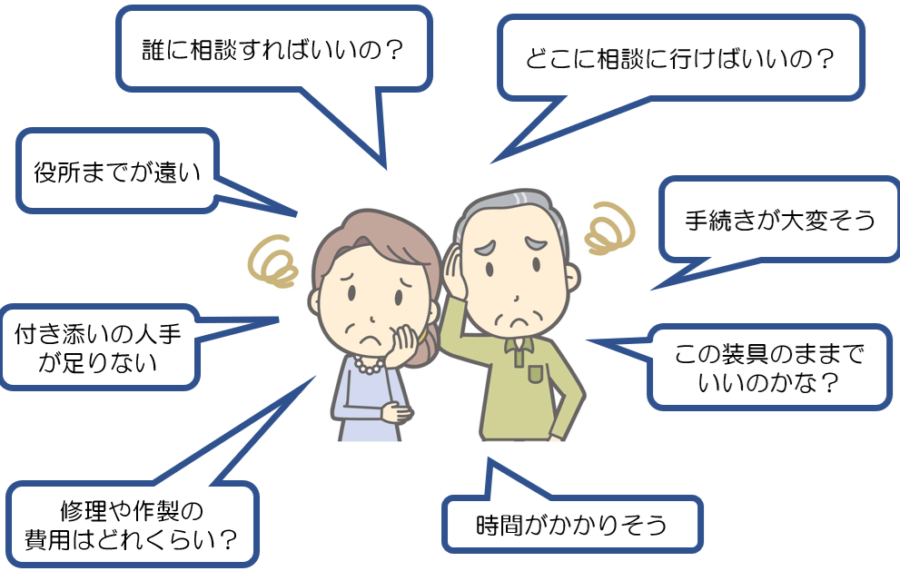 こんなとき皆さんはどうしていますか?装具の修理や作製をしたいと思ったとき、「誰に相談すればいいの?」「費用はどれくらい?」「このまま使っていて大丈夫なの?」など困ったことはありませんか?そんな現場でよく聞かれる声を、以下の図にまとめました。