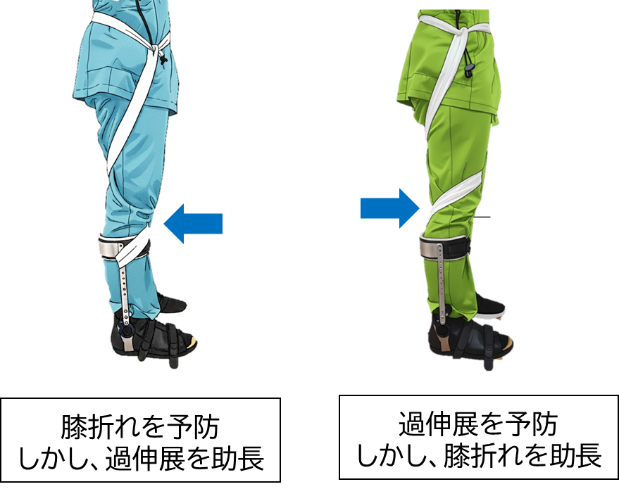 膝関節の前面を通る場合: 膝折れを予防できます。しかし、その反面、膝の過伸展が助長される可能性があります。
