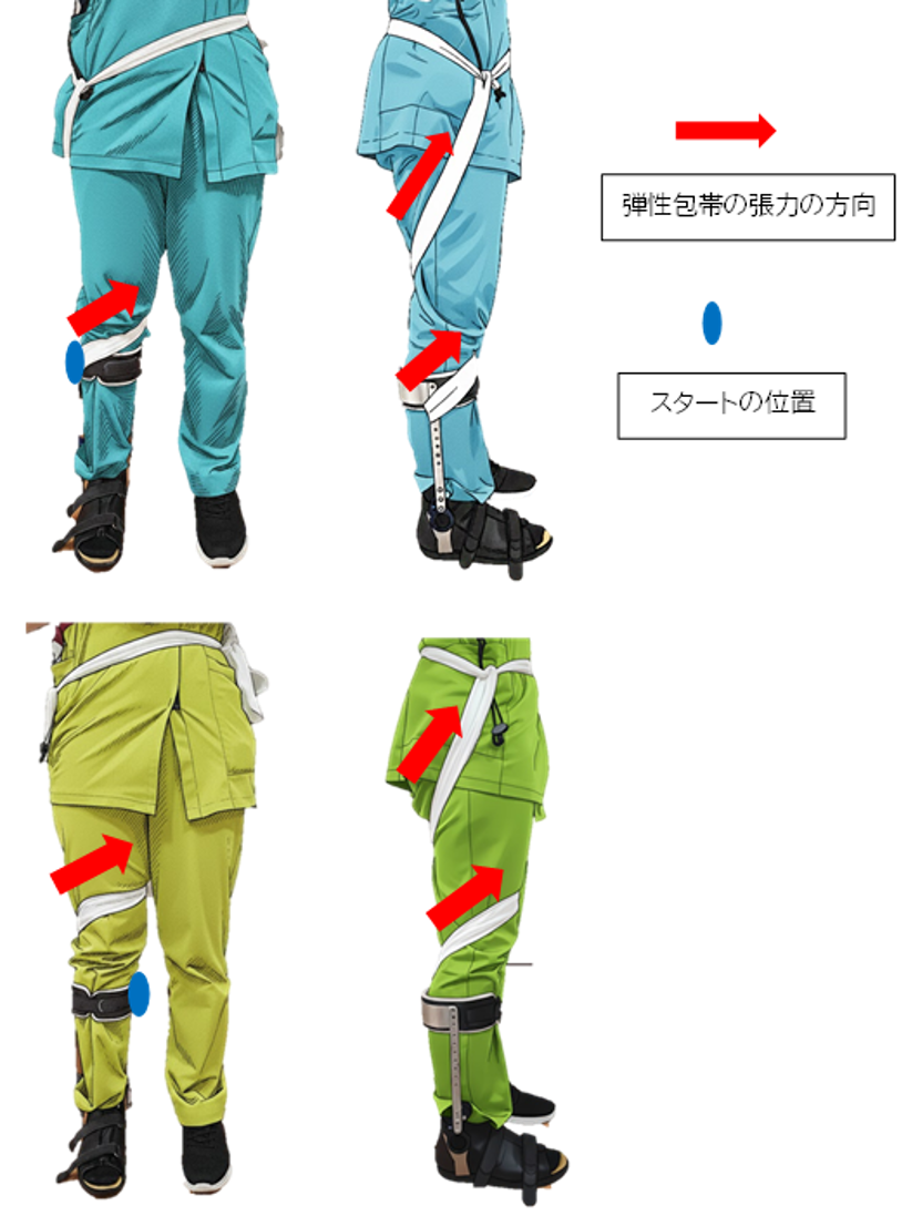 装具の金属支柱の内側または外側に弾性包帯の中心を引っかけ、二つに束ねた弾性包帯をスパイラル状に巻きます。大転子付近で一度結び、そのままウエストまで巻き付けます。最初に股関節を内旋位にしてスタートすると、より効果的な矯正力が得られます。