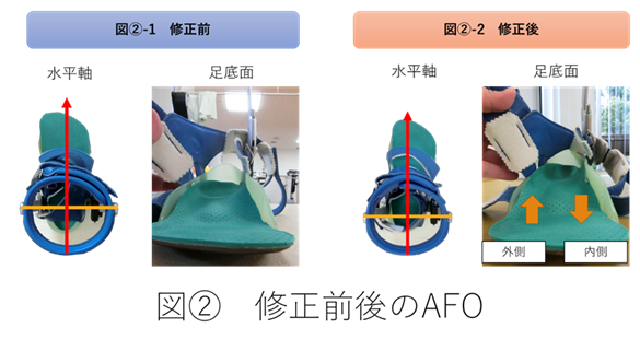 内反の原因を理学療法士と義肢装具士、医師で協議した結果、足部が水平軸に対して内転していることが原因(図②-1)と考え、水平軸に対して足部を外転方向に修正(図②-2)しました。また、足底面の内側を下げ、外側を上げることで内反を矯正させました。