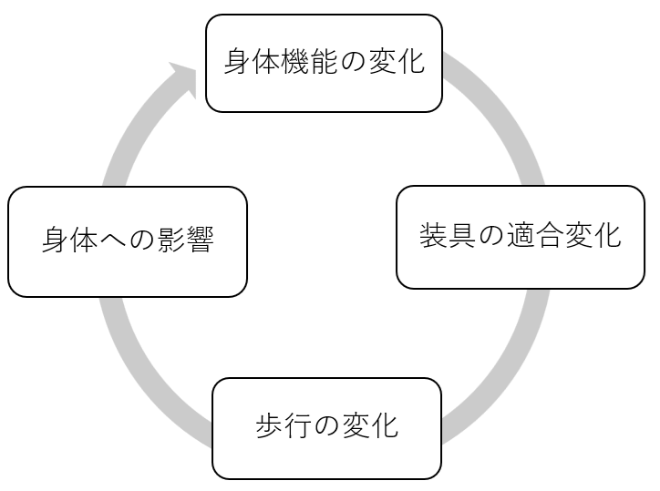 こうした変化はゆっくり進むため、気づきにくいのが特徴です。しかし、装具の適合がわずかに変わるだけでも歩行には影響が出ます。歩き方の変化が身体の使い方に影響し、さらに歩行全体が変わっていくこともあります(図2)。